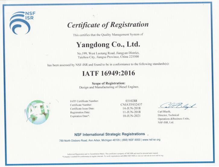 Description: Ce certificat indique que le système de gestion de la qualité a été évalué par le NSF-ISR et est conforme aux normes IATF 16949:2016.
